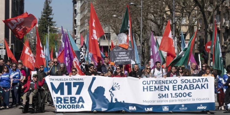 Hoy ha tenido lugar en Álava una jornada de huelga convocada por los sindicatos ELA, LAB, Steilas, Etxalde y Hiru, bajo el lema «El salario mínimo de la mayoría se decide aquí». A la manifestación principal, en Gasteiz, se han congregado 15.000 personas para expresar su demanda de una mejor distribución de la riqueza y la obtención de salarios más altos.